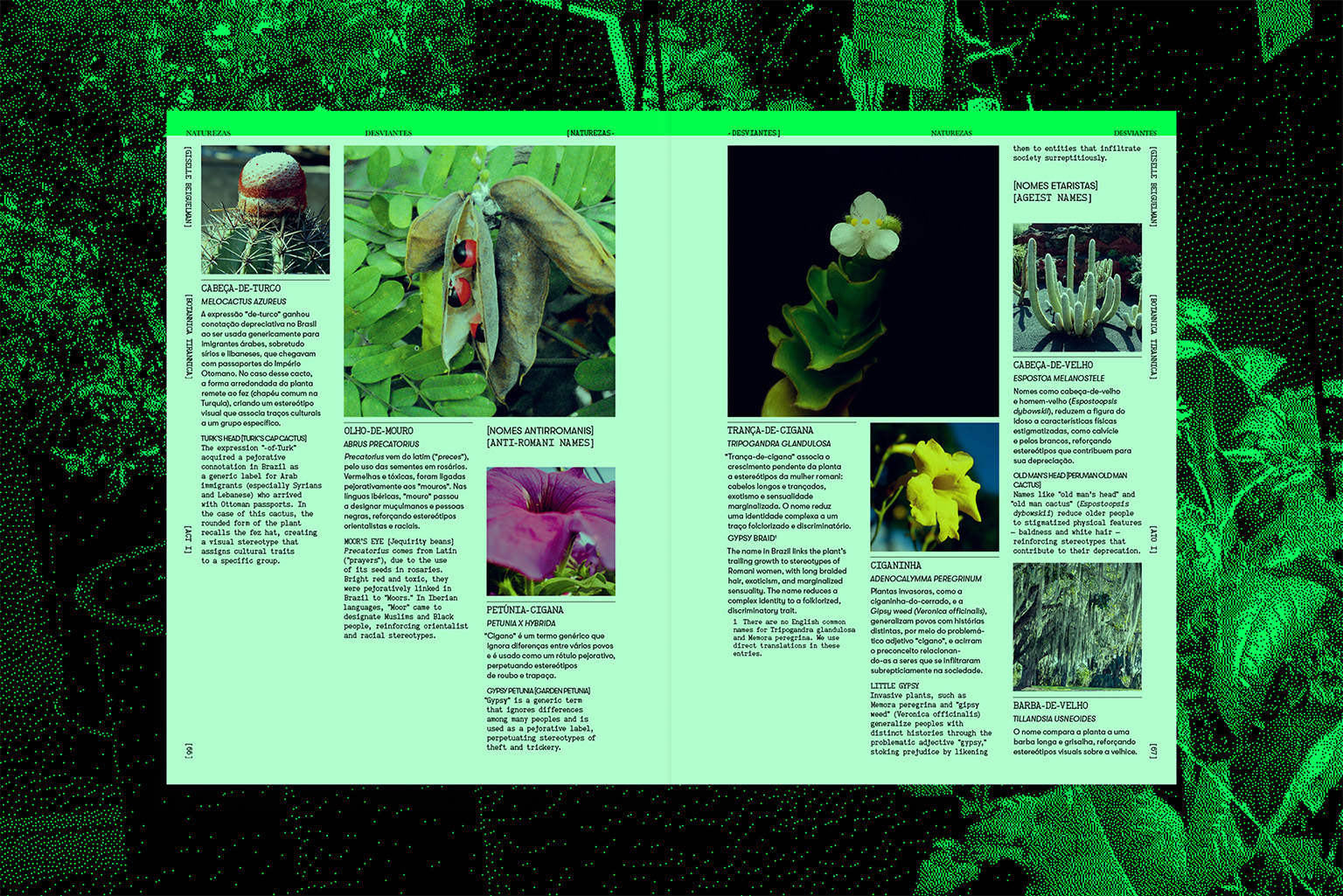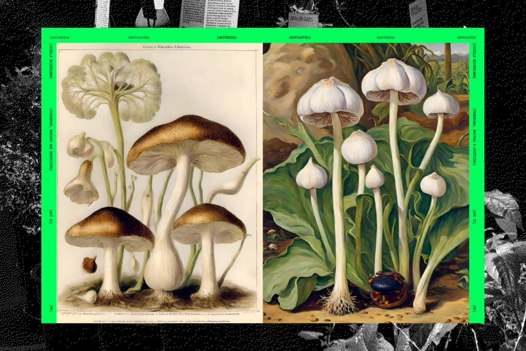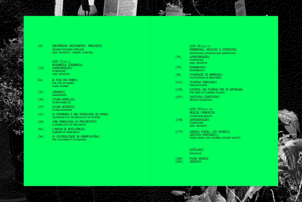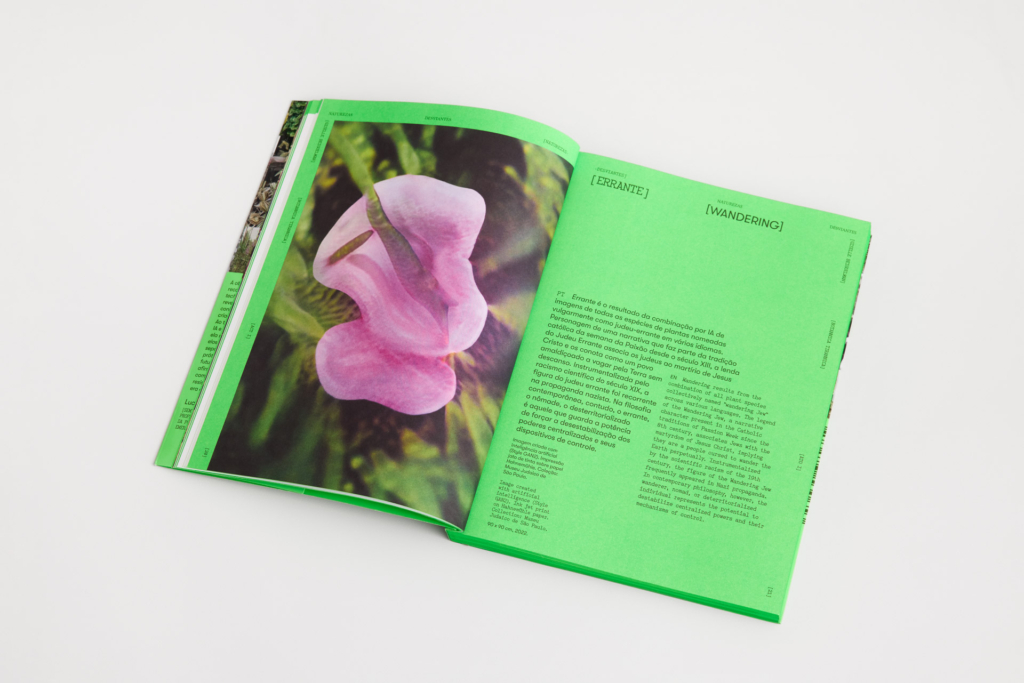 Visual identity and signage for the exhibition Naturezas Desviantes, by Giselle Beiguelman, at MARGS. The show brought together three projects developed over the past five years, each addressing relationships between botany, coloniality and digital technologies: Botannica Tirannica, which reinvents, with artificial intelligence, names of plants marked by stigmas (such as Maria-sem-vergonha, Olho-de-mouro and Judeu-errante), creating the “garden of resilience”. Venenosas, Nocivas e Suspeitas, which recovers plants prohibited or erased by the colonial process, narrating their memories through women made invisible by art and science, and Beleza Corrosiva, which discusses the environmental impact of digital technologies with a video generated by artificial intelligence and a collaborative process of donating electronic waste, later sent to recycling cooperatives. The exhibition was curated by Eder Chiodetto.
